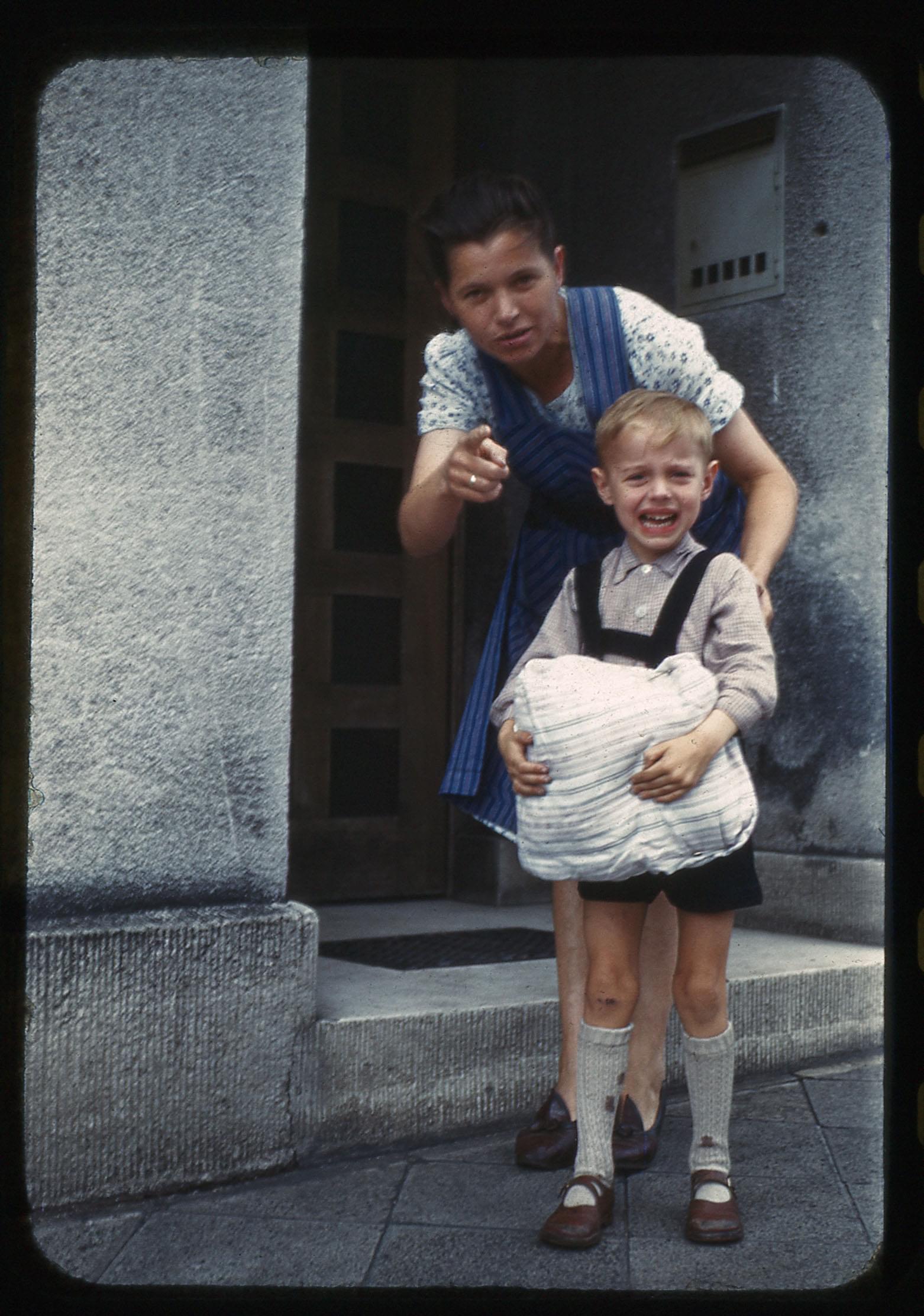 "Boy receives clothing bundle / summer, 1950"