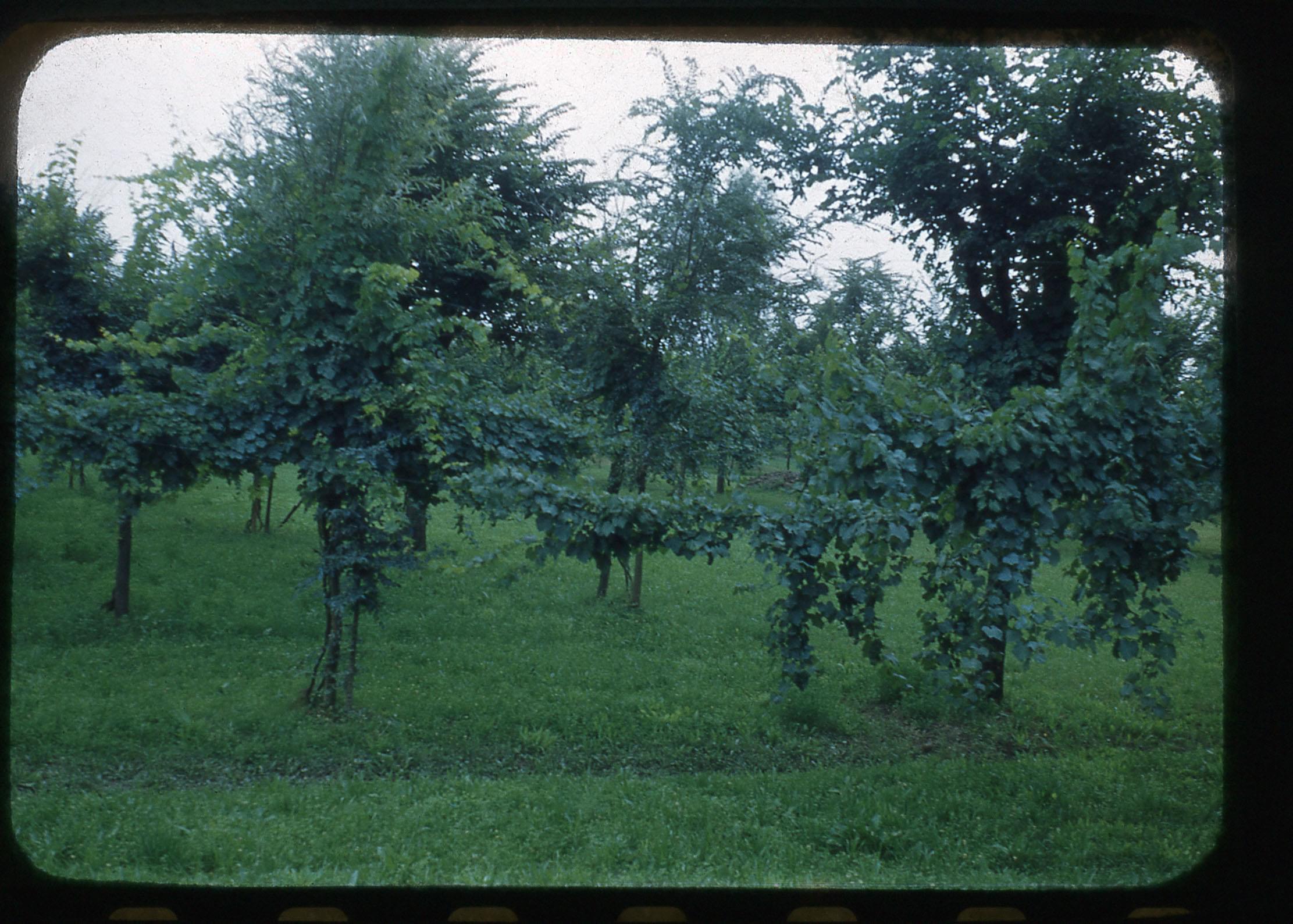 "grapes growing on apple trees, Italy, 1951"