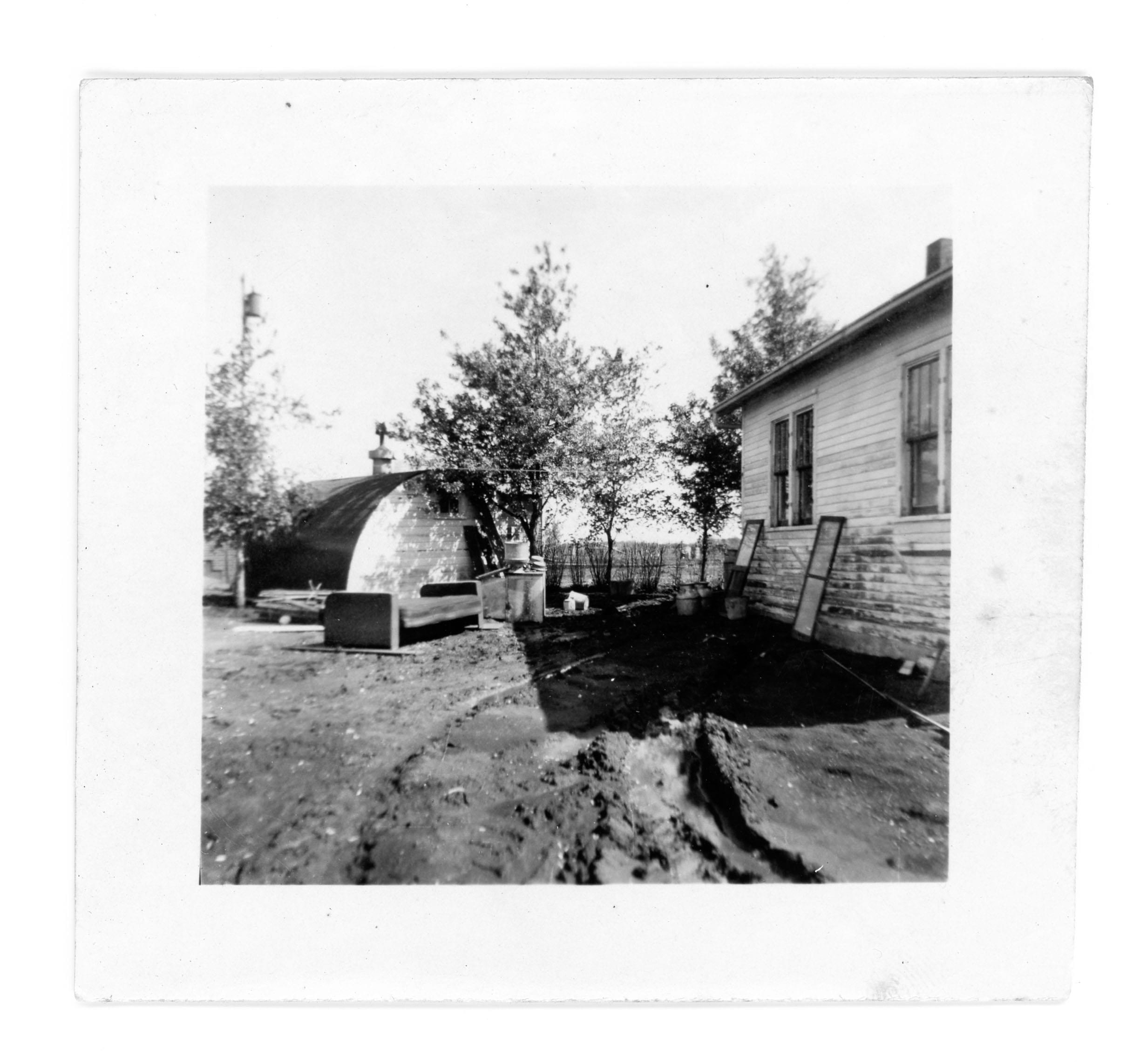 "This chicken house landed between the tree and the pole."