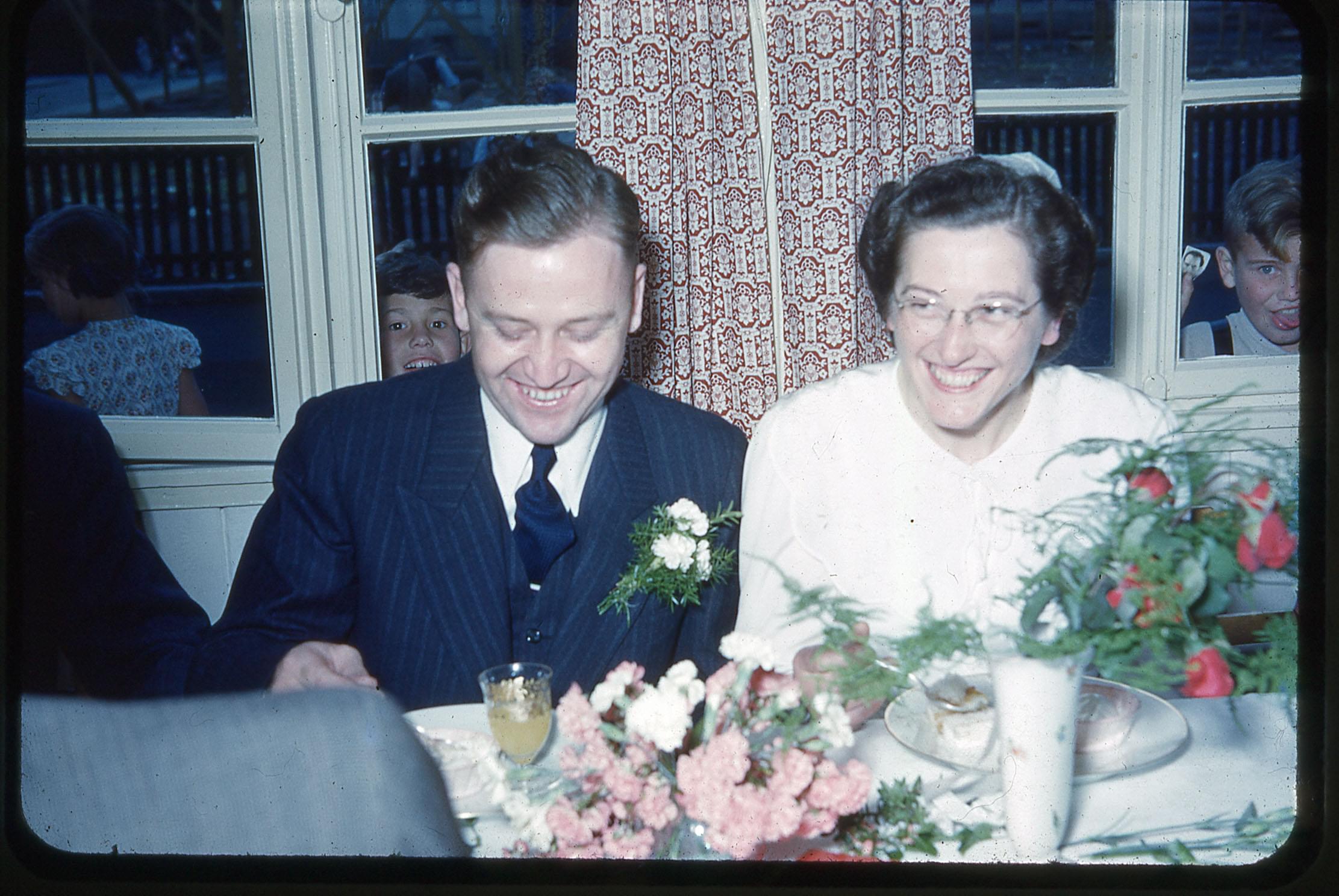 - "Peter & Edith eating ice cream & cake at reception. / July 15, '51"